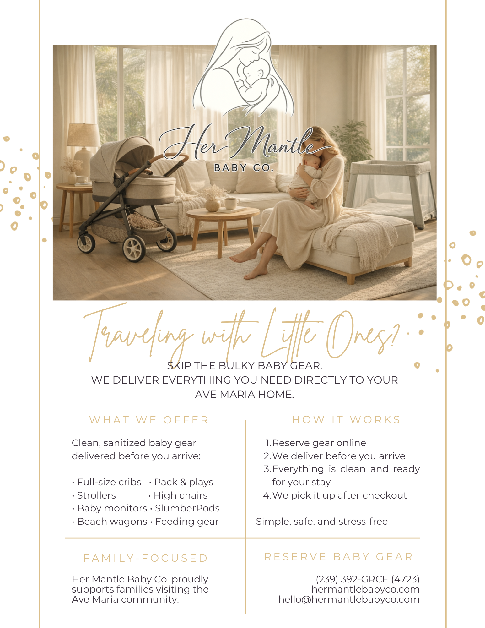 Her Mantle Baby Co. helps make travel easier by providing clean, high-quality baby gear rentals delivered directly to your guests in Ave Maria.